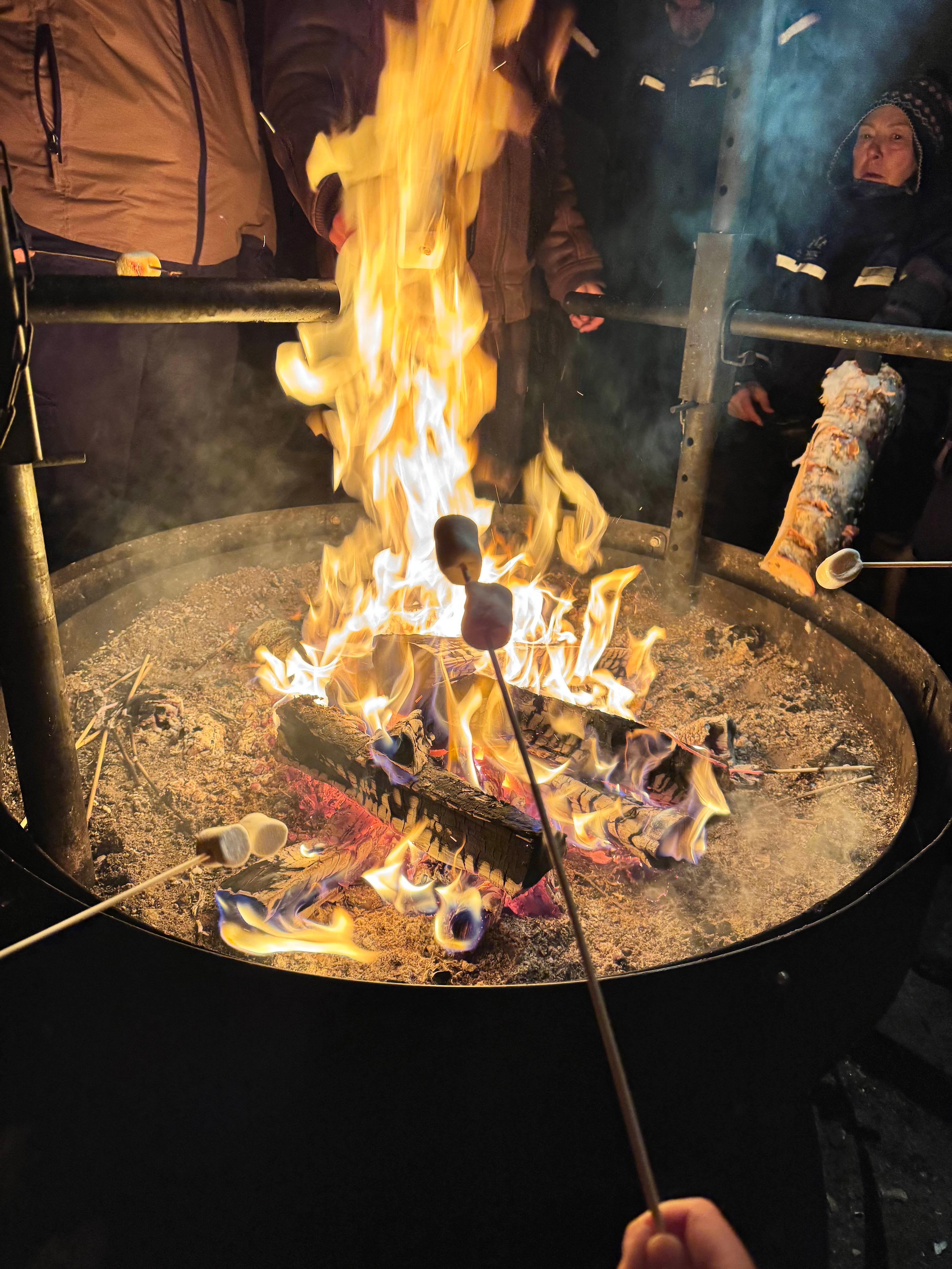 오로라가 연해진 사이에 추위를 달래러 천막으로 들어가보면 마쉬멜로우 파티가 열려있습니다.