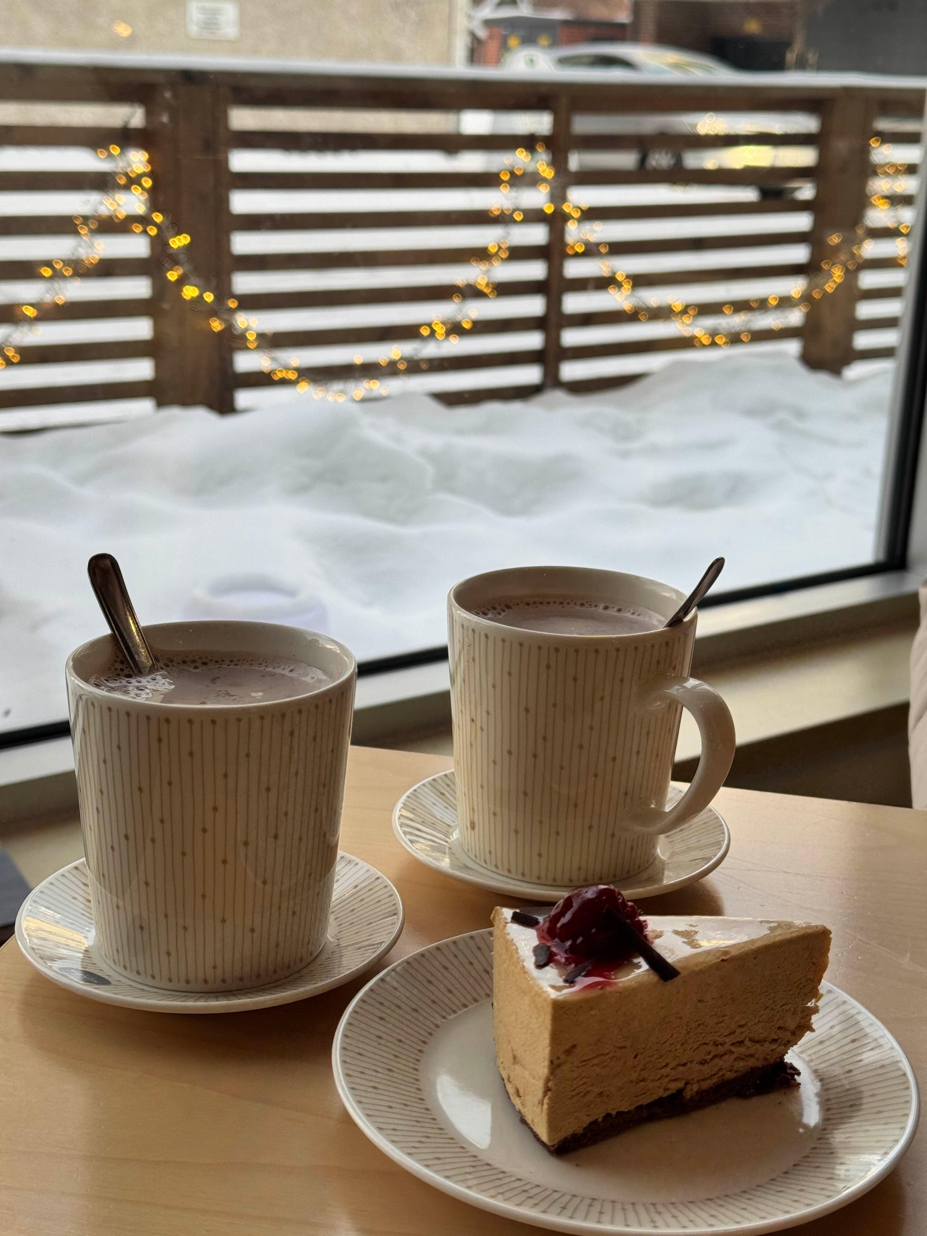 핫초코는 분말을 우유에 타준 느낌이어서 많이 달지 않았는데, 오히려 좋았어요. 케이크는 식감이 특이했는데 맛이 막 제 취향은 아니었어요. 다만 따뜻한 실내에서 조용한 분위기를 즐기기에는 좋았어요.