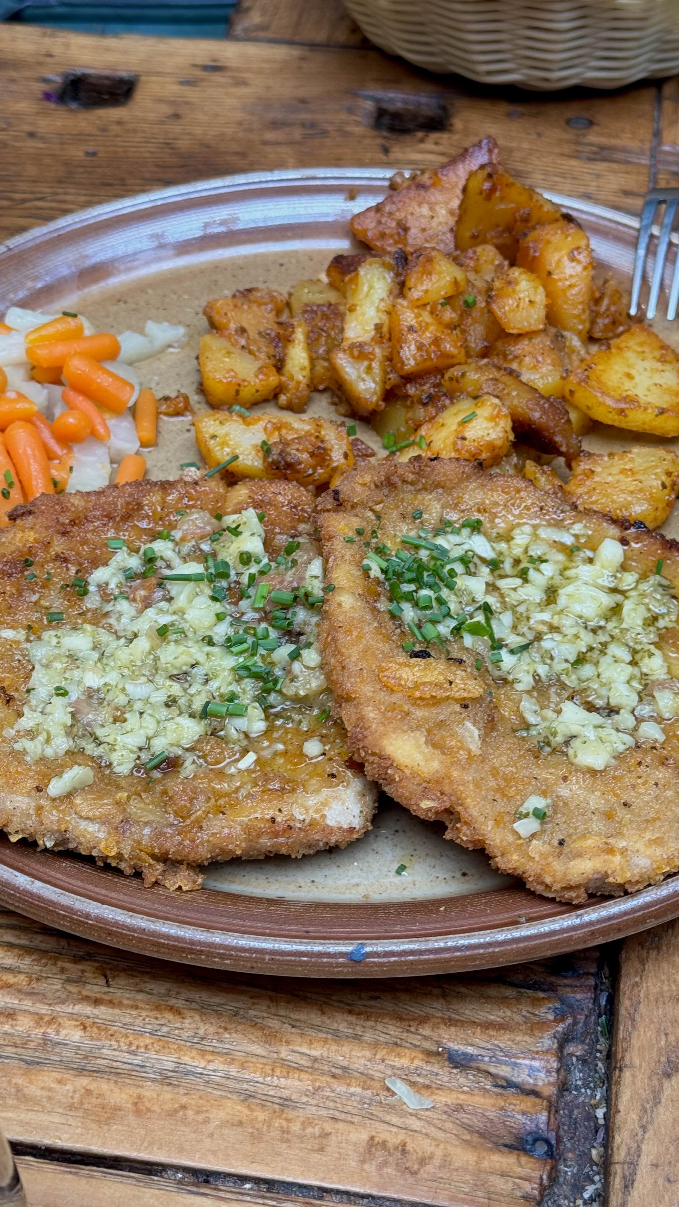 갈릭 슈니첼이에요. 큰 고깃 덩어리 두 개가 나오는데, 둘이서 하나 시켜서 한 덩이씩 먹어도 배가 불렀어요. 다른 사람들을 보니 인당 하나씩 시켜서 남기더라구요. 둘이가셔서 하나 드셔도 충분할거예요.