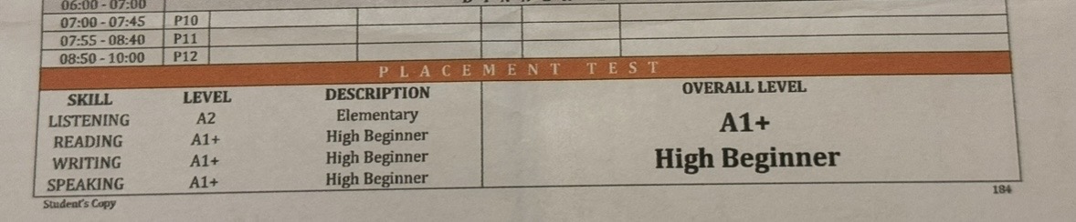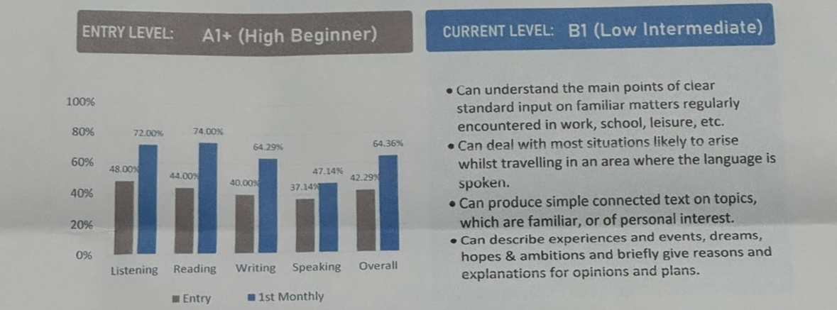 저는 입학 시험에서는 A1+(high beginner) 등급을 받았고, 한 달 뒤 진행한 monthly test에서는 B1(Low intermediate) 등급을 받았습니다. Beginner to Intermediate, 두 계단 오른 셈인데요.
